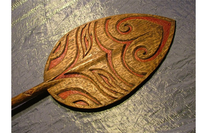 Alaka'ina means guidance in Hawaiian. The imagery carved into the paddle depicts a navigational star, the ocean, a mother and baby whale, the mountains and the wind (from bottom to top).