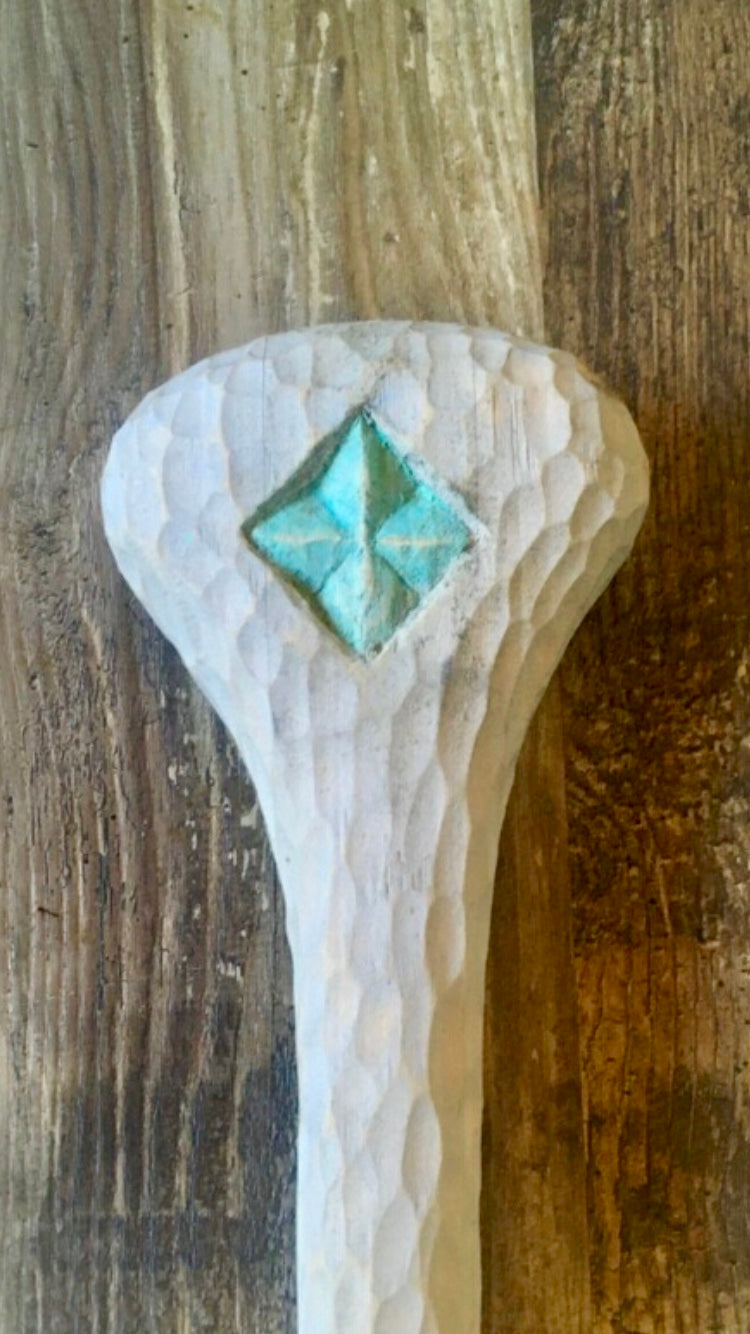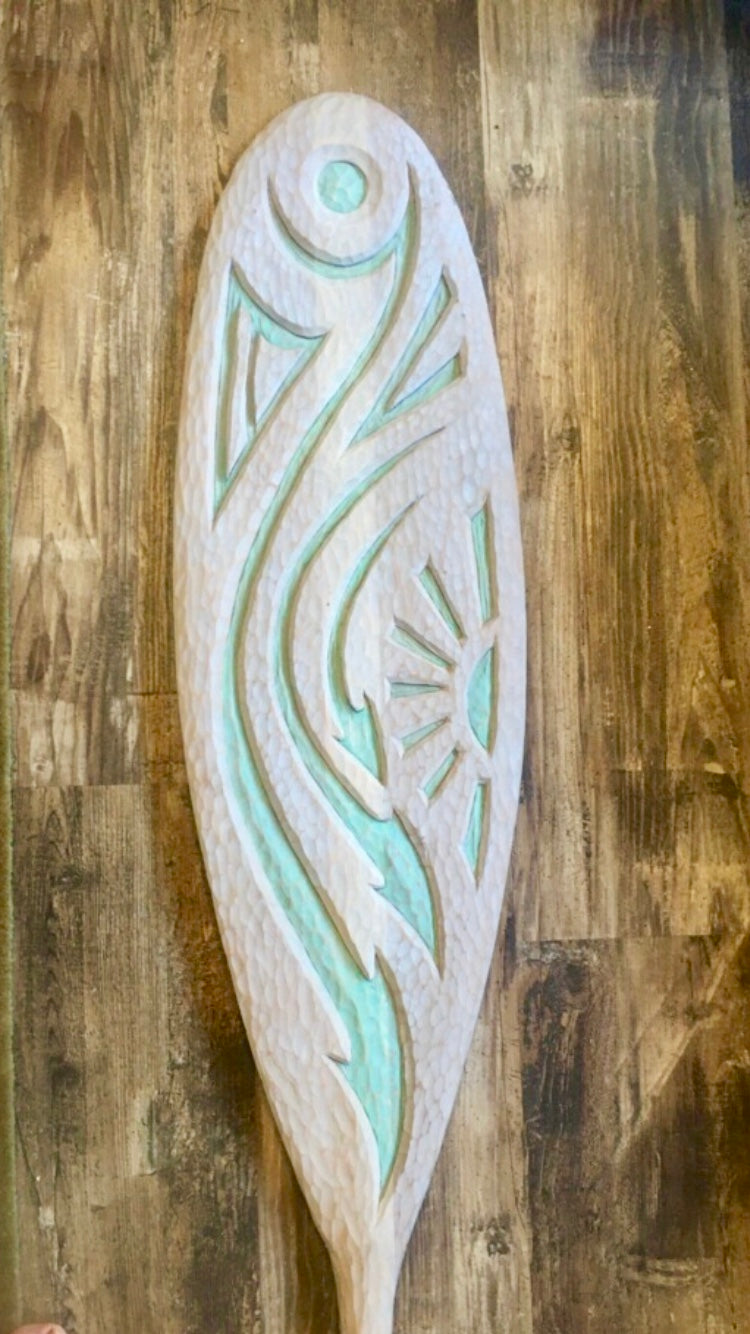 Hand carved by Ryan Cameron. This large, 8 foot tall paddle is currently available to ship.